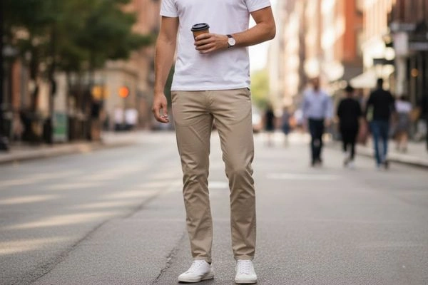 AI-generated image of a man in a white tee, beige chinos, and sneakers.