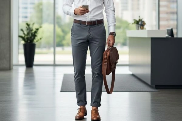 AI-generated image of a man in charcoal chinos and tan-accented business-casual style.