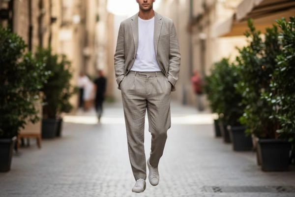 Versatile Styling: Casual tailored suits pair well with informal pieces such as knit polos, roll‑neck sweaters, and even sneakers. For example, a linen blend suit worn with a crisp white tee and minimalist sneakers feels polished yet laid back.
